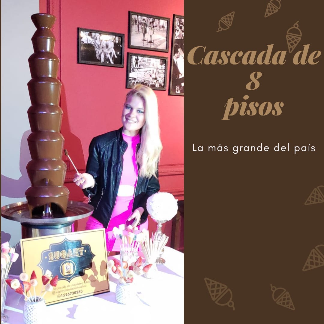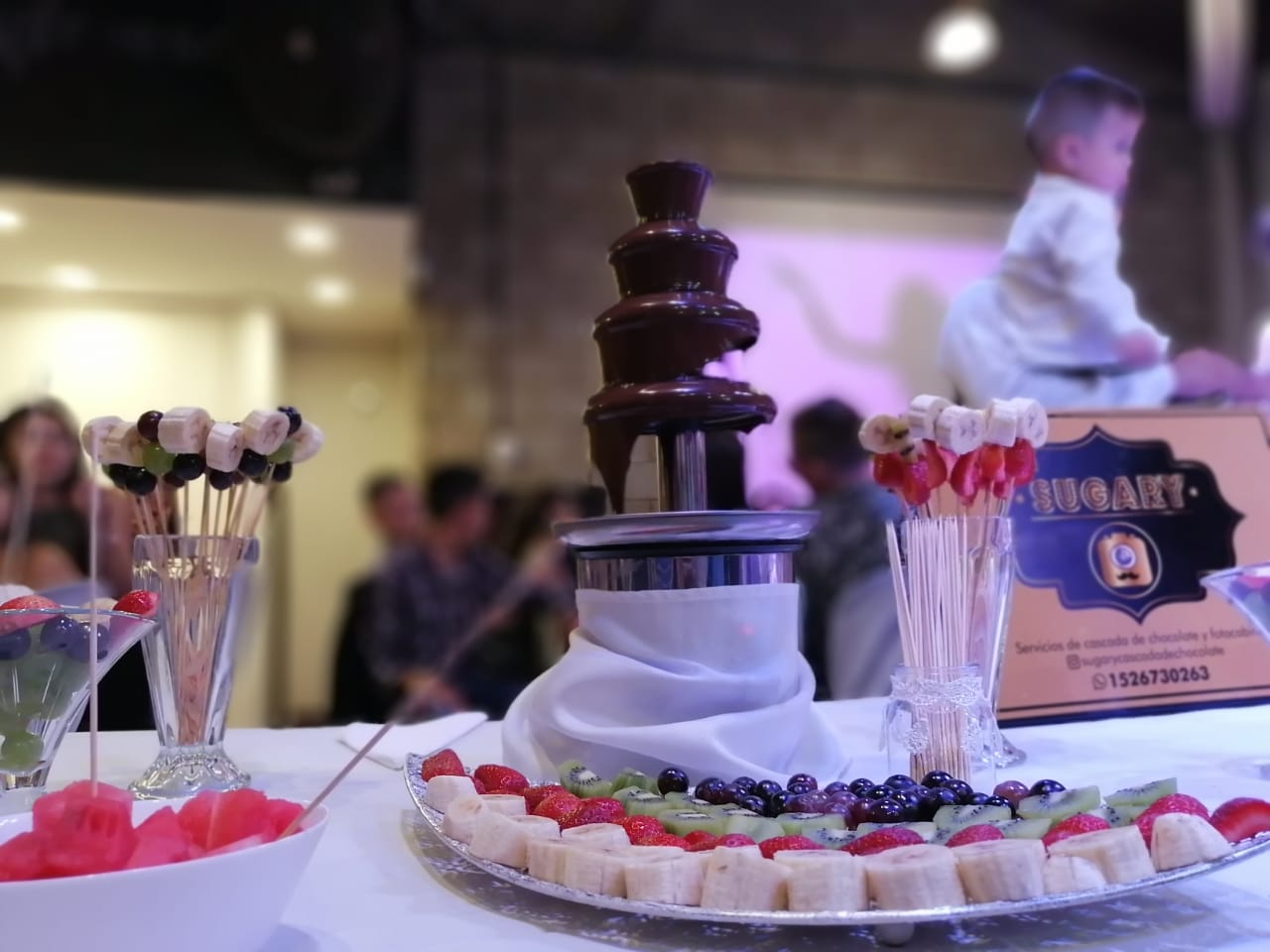 Servicio de cascadas de chocolate con 4 y 8 pisos para eventos, incluye variedad de frutas frescas y snack.
